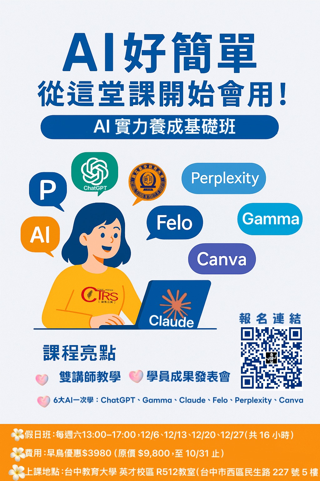 課程時間|12/6 起每週六 13:00-17:00(台中中教大)