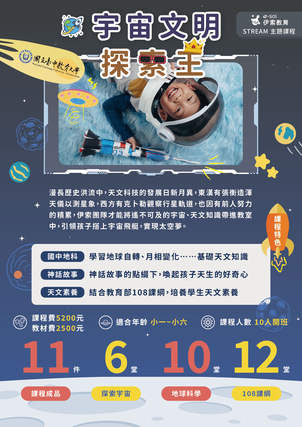 課程成品11件、探索宇宙6堂、地球科學10堂、108課綱12堂、結業證書x1
