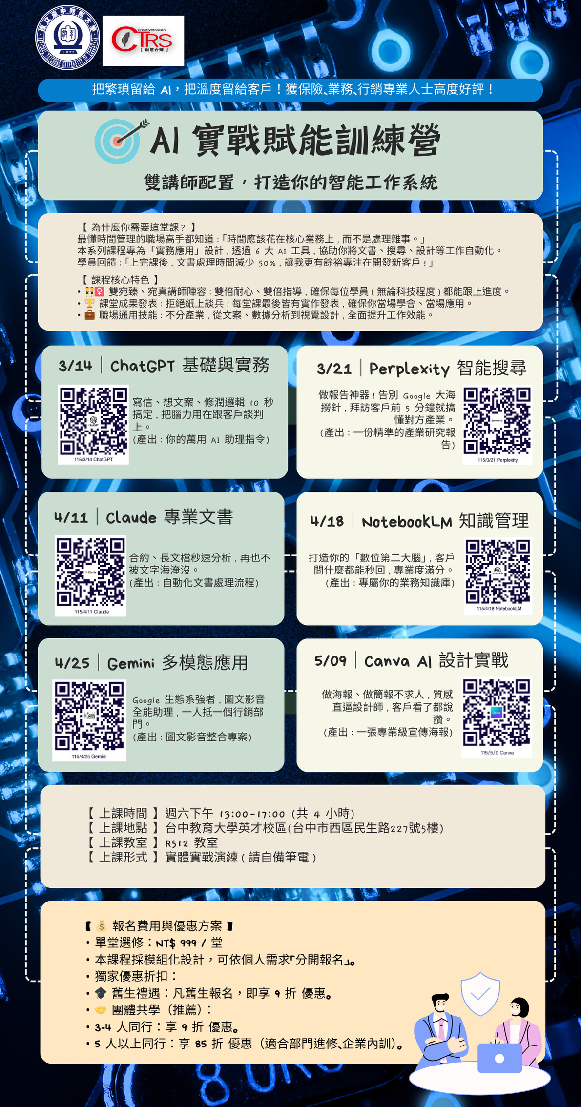 本系列課程專為「實務應用」設計,透過 6 大 AI 工具,協助你將文書、搜尋、設計等工作自動化。