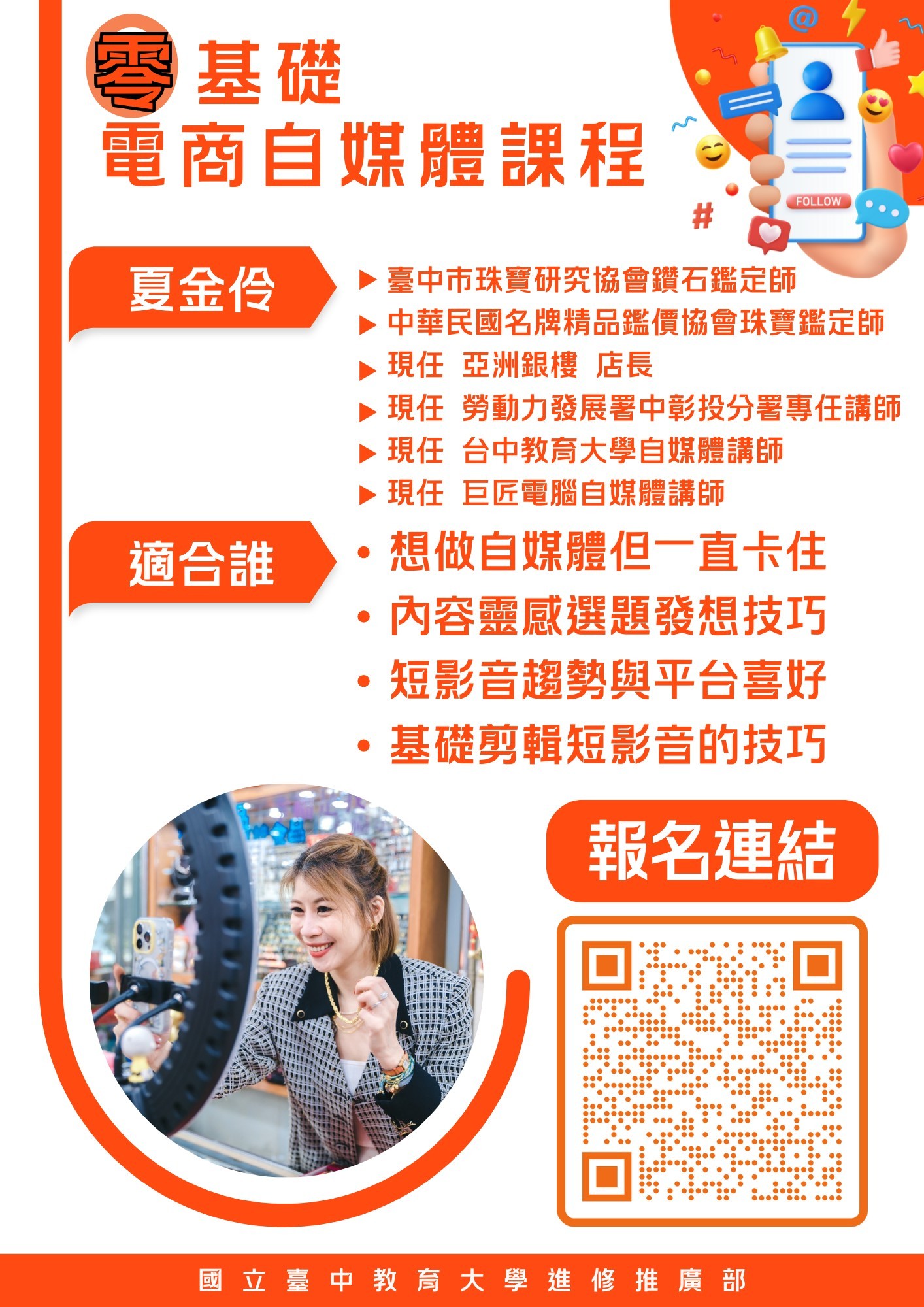這門課程適合完全不懂社群平台操作、希望從零開始學習自媒體的您;無論您是對自媒體有興趣的初學者還是想建立個人品牌、透過網路提升影響力的創業者,這門課程都能幫助您掌握從基礎到進階的實用技巧。