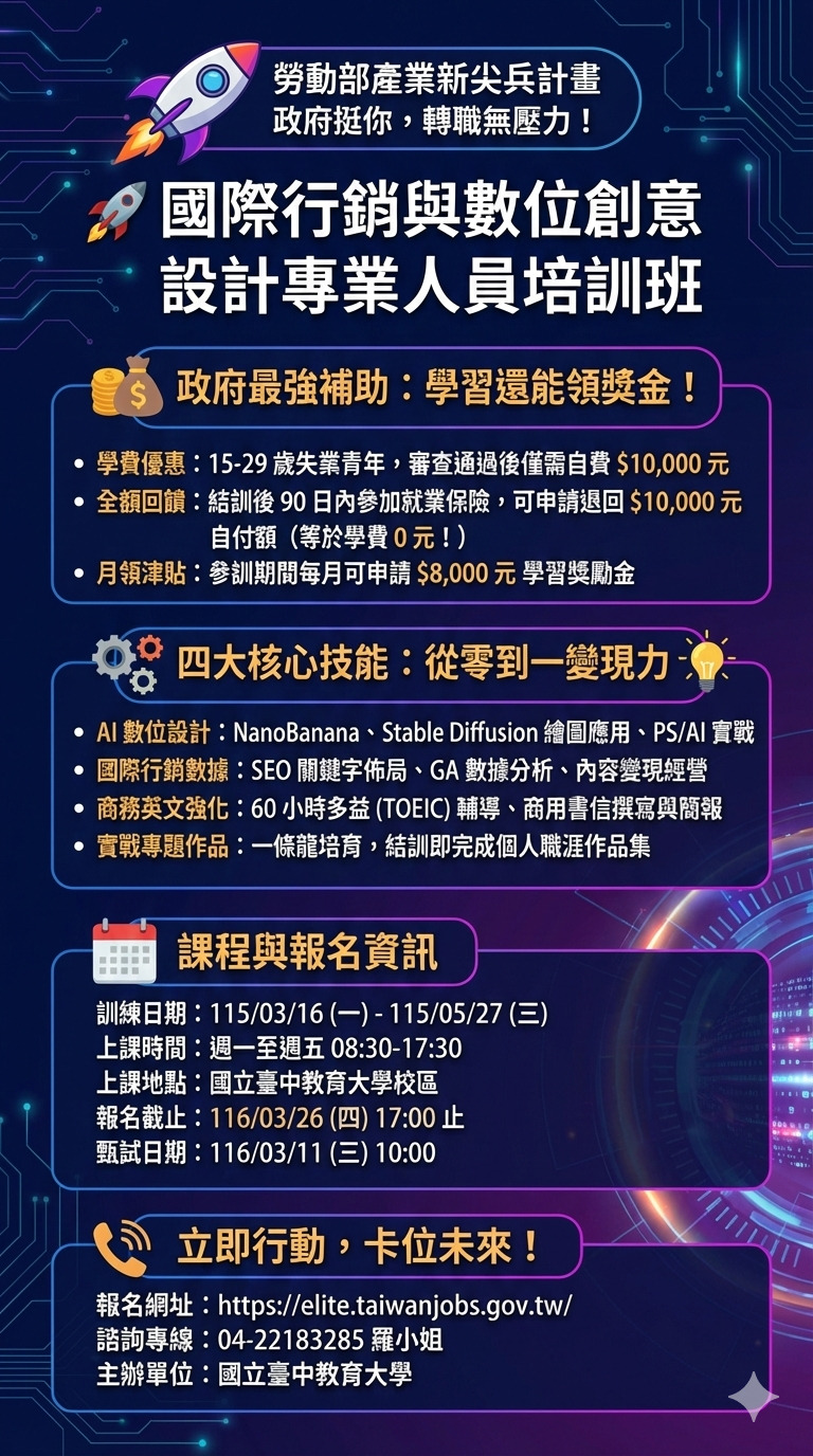在全球化競爭與數位科技快速更迭的環境下,企業對兼具「行銷思維」、「數據分析」與「商務外語」的人才需求日益殷切。本培訓班由勞動部勞動力發展署指導,國立臺中教育大學主辦,透過 400 小時的系統化訓練,協助待業青年從基礎理論到實戰演練,全面提升專業競爭力。