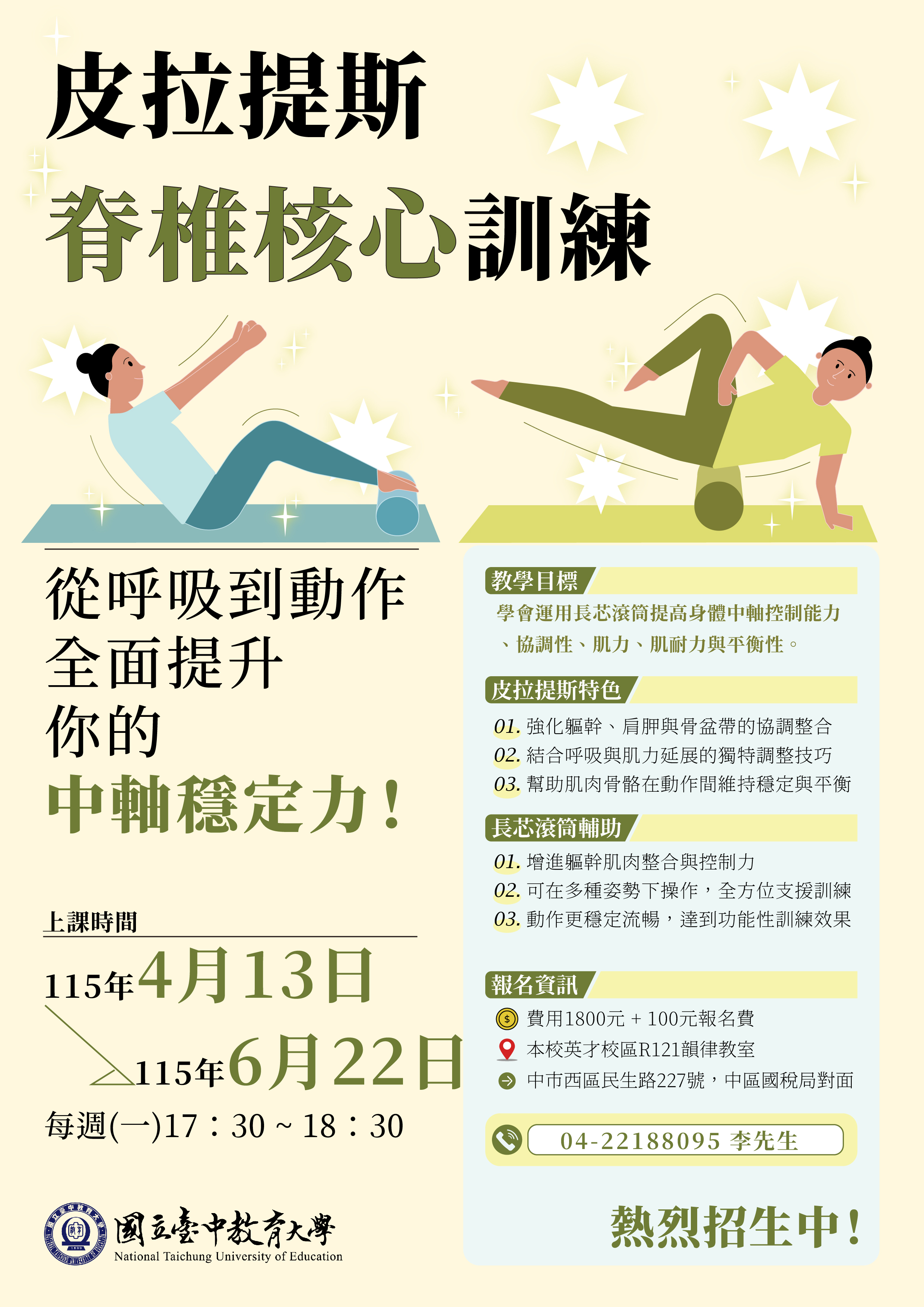 《115年-皮拉提斯脊椎核心運動班》週一傍晚班(17:30-18:30點) 招生摟~