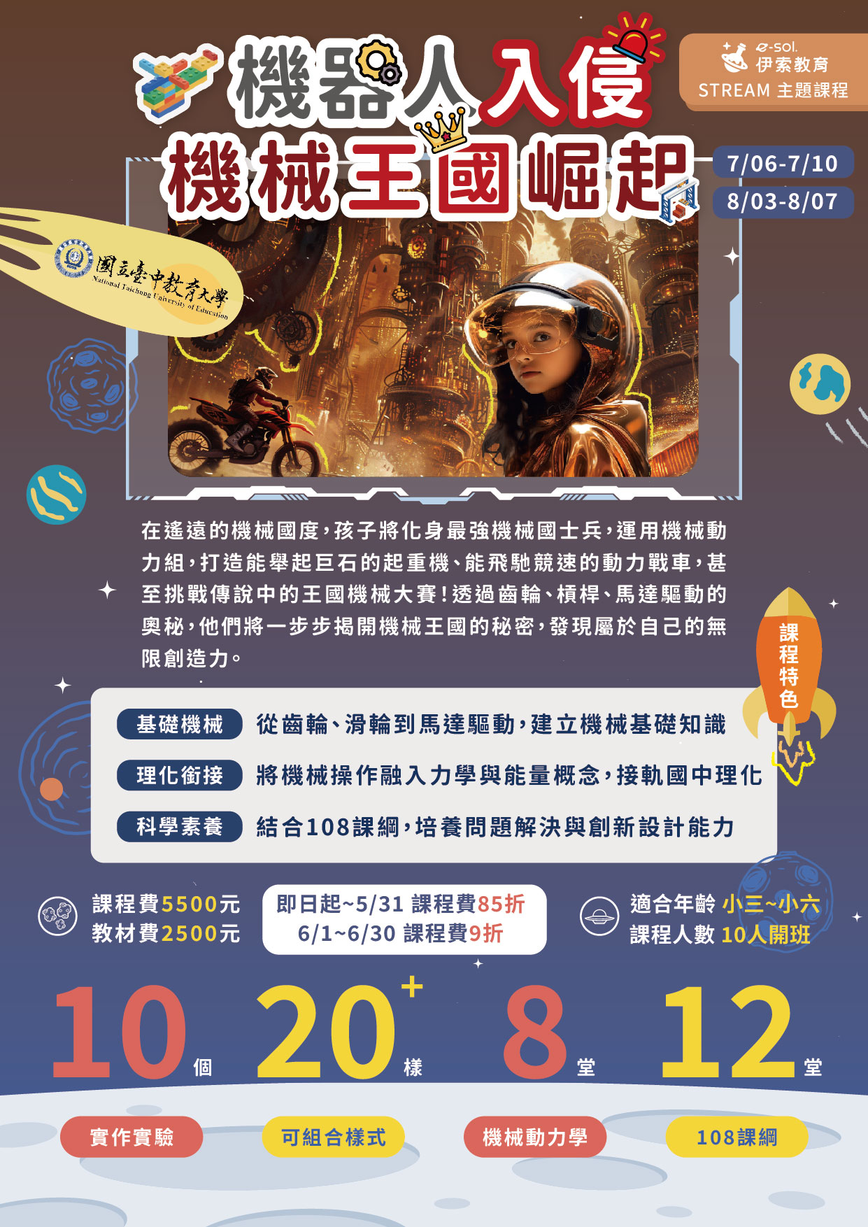 在遙遠的方塊星球上,孩子將化身最強機械國士兵,運用機械動力組,打造能舉起巨石的起重機、能飛馳競速的動力戰車,甚至挑戰傳說中的王國機械大賽!透過齒輪、槓桿、馬達驅動的奧秘,他們將一步步揭開機械王國的秘密,發現屬於自己的無限創造力。