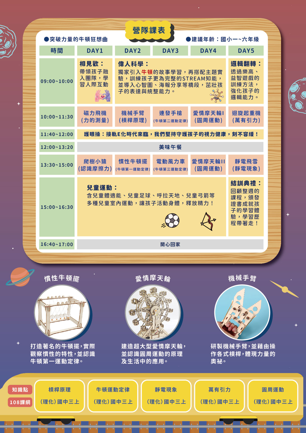 實作實驗9個、實驗成品9件、基礎力學10堂、108課綱13堂、結業證書x1