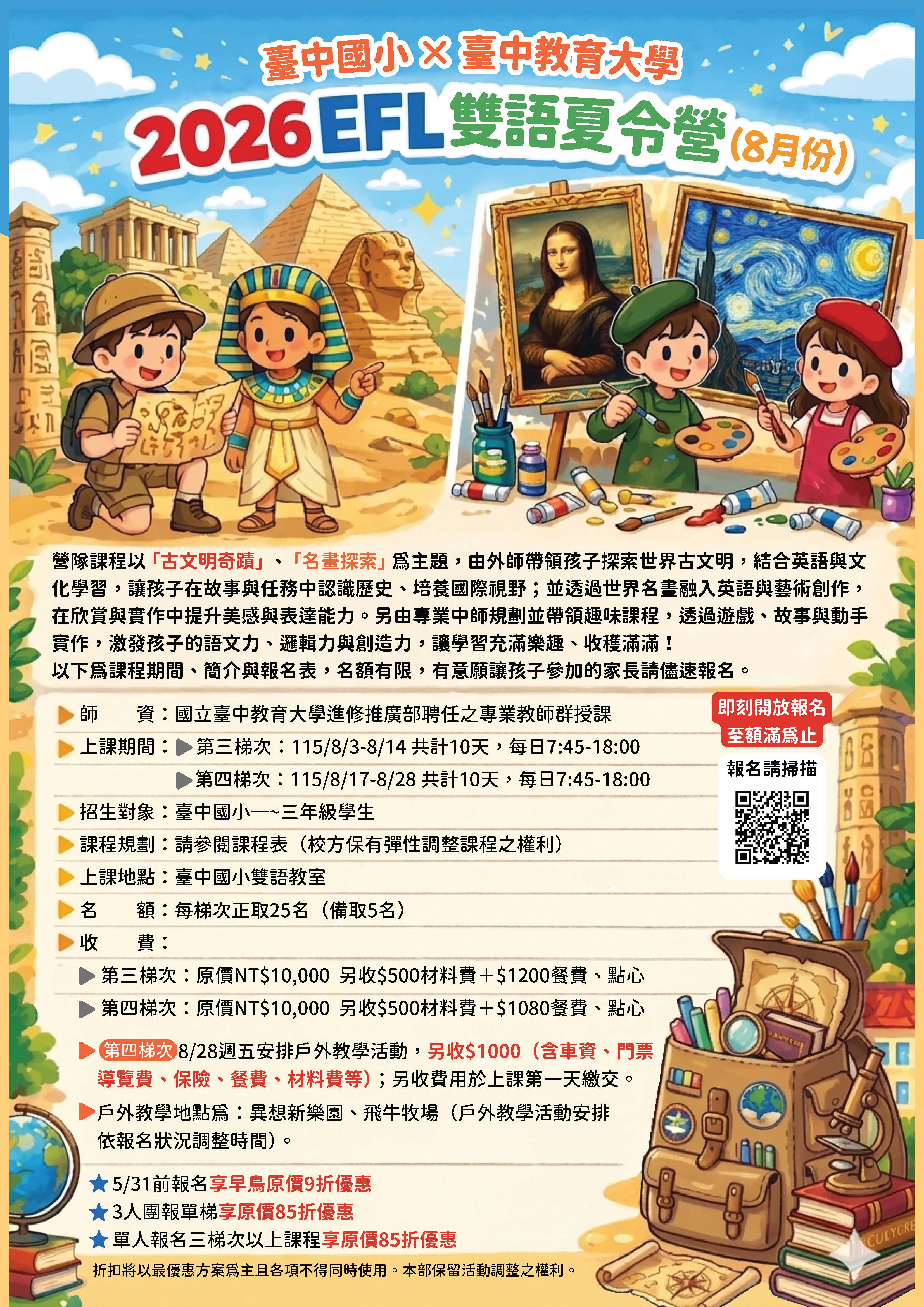 營隊課程規劃以「古文明奇蹟」、「名畫探索」為主題,由外師帶領孩子透過探索世界古文明,結合英語與文化學習,讓孩子在故事與任務中認識歷史、培養國際視野。並結合世界名畫搭配英語與藝術創作,讓孩子在欣賞與實作中提升美感與表達能力! 由專業中師設計並帶領的趣味課程,透過遊戲、故事、動手做,激發孩子的語文力、邏輯力與創造力,快樂學習,收穫滿滿!