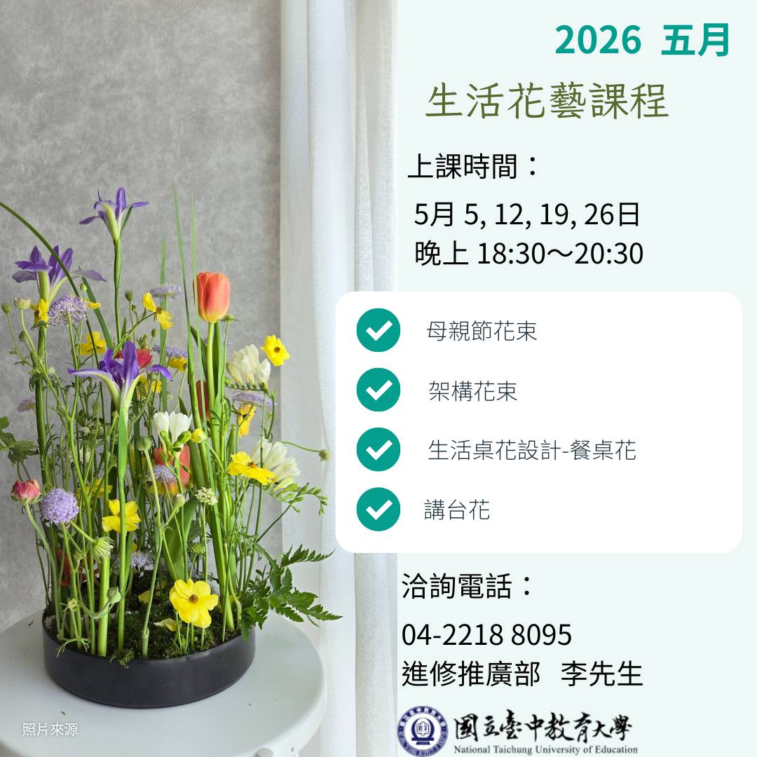 ◇時間:115年5月5日至5月26日,共4週,每週二晚上18:30-20:30