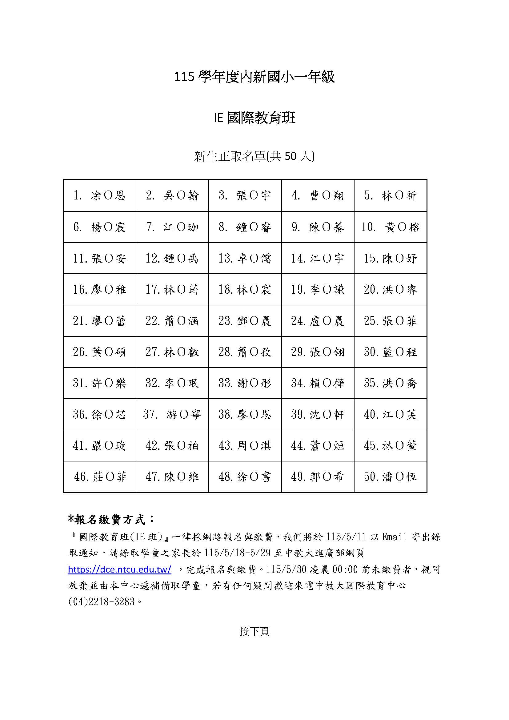 【公告】內新國小115學年度一年級IE國際教育班正取生與備取生錄取名單